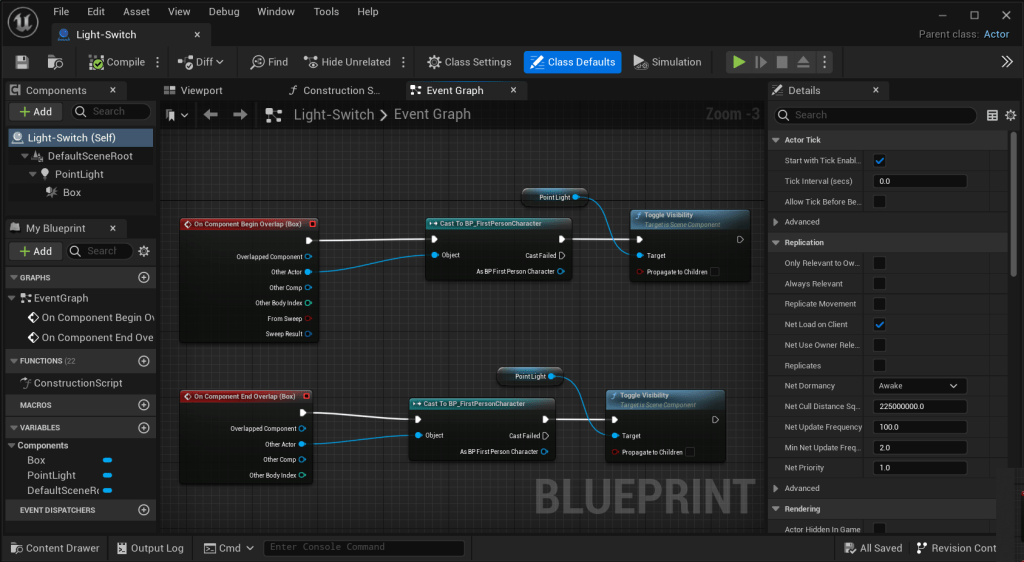 We were taught how to create a light that turns on when the player is near it. I created an actor that had a point light inside a collision detection box.