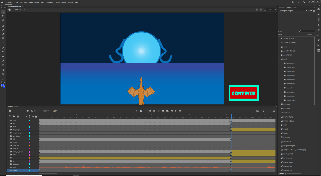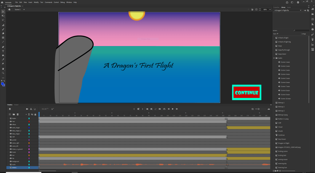 The second scene was one of the more complicated due to a suggestion from a classmate. His suggestion was to instead of having the dragon just fly into the portal to have dragon fly and to move the background as well to show motion. so using motion tweens I made the dragon fly as well as the ocean and the sky so that it looks like you are moving with the dragon. I finished off this scene by having it look like the portal envelopes the viewer and the dragon by having a white light come out the portal and cover the screen.