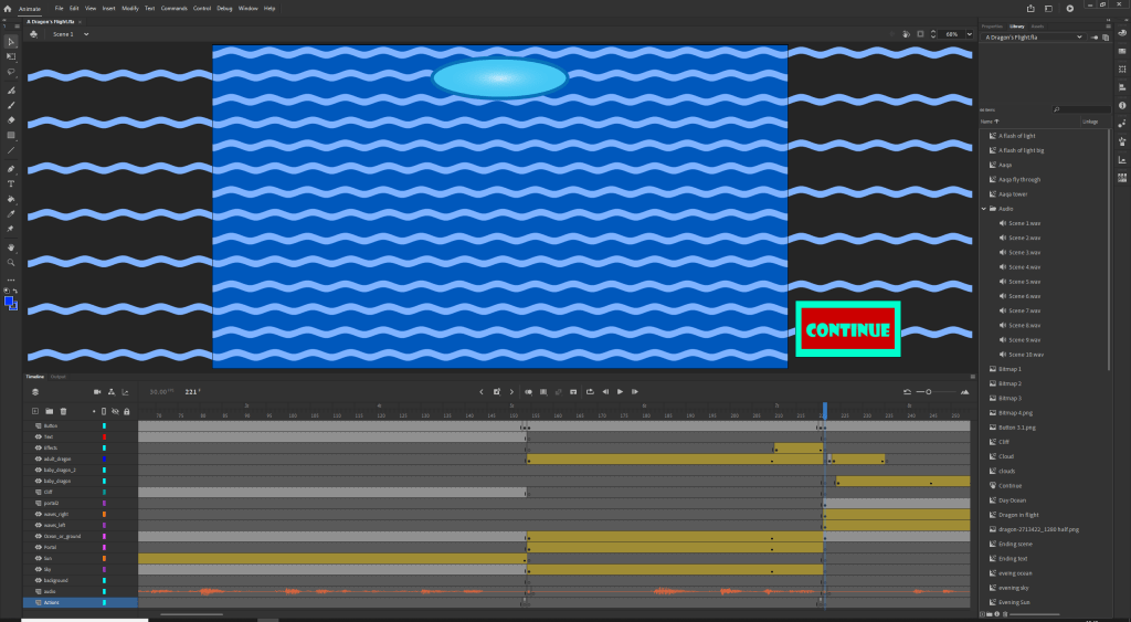 For the third scene I want to show the turbulent waves of Sea of Worlds I found a vector graphic of a wave and linked multiple together in a symbol then placed two of the same symbol that interlaced. I then used motion tweens to have them move horizontally to show movement in the waves. I also added the dragon from the previous scene flying out the portal and then the younger dragon splitting off from his mother.