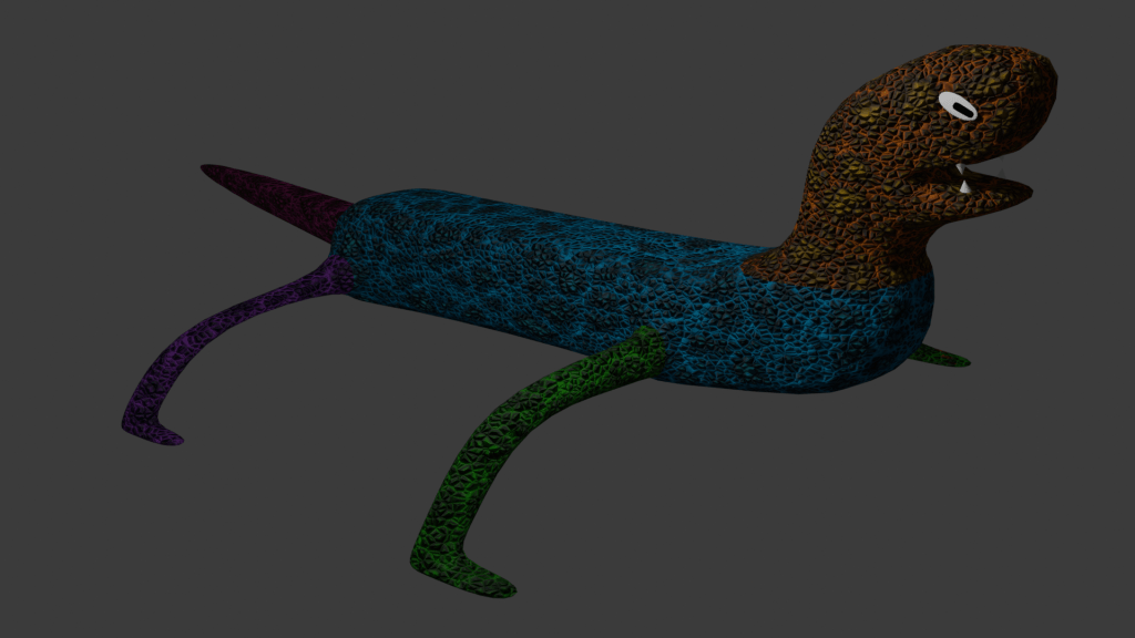 With the second creature I wanted to make some form of lizard of currently unknown elemental affinity. I based it off a picture I found of a lizard on the internet mostly for reference. I then followed a tutorial for a procedural lizard skin and made him varying colours to give me some reference on what affinity it may have.
