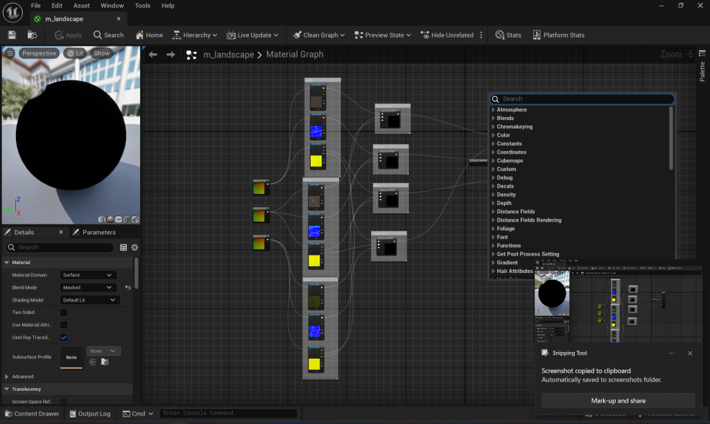 It started off by explaining how to make a landscape and then creating a material for it by setting up three texture samples with landscape coordinate nodes and linking them into the correct sockets for the base colour, normal, ambient occlusion (A/O) and roughness with the A/O and roughness being able to drawn from the same texture sample.