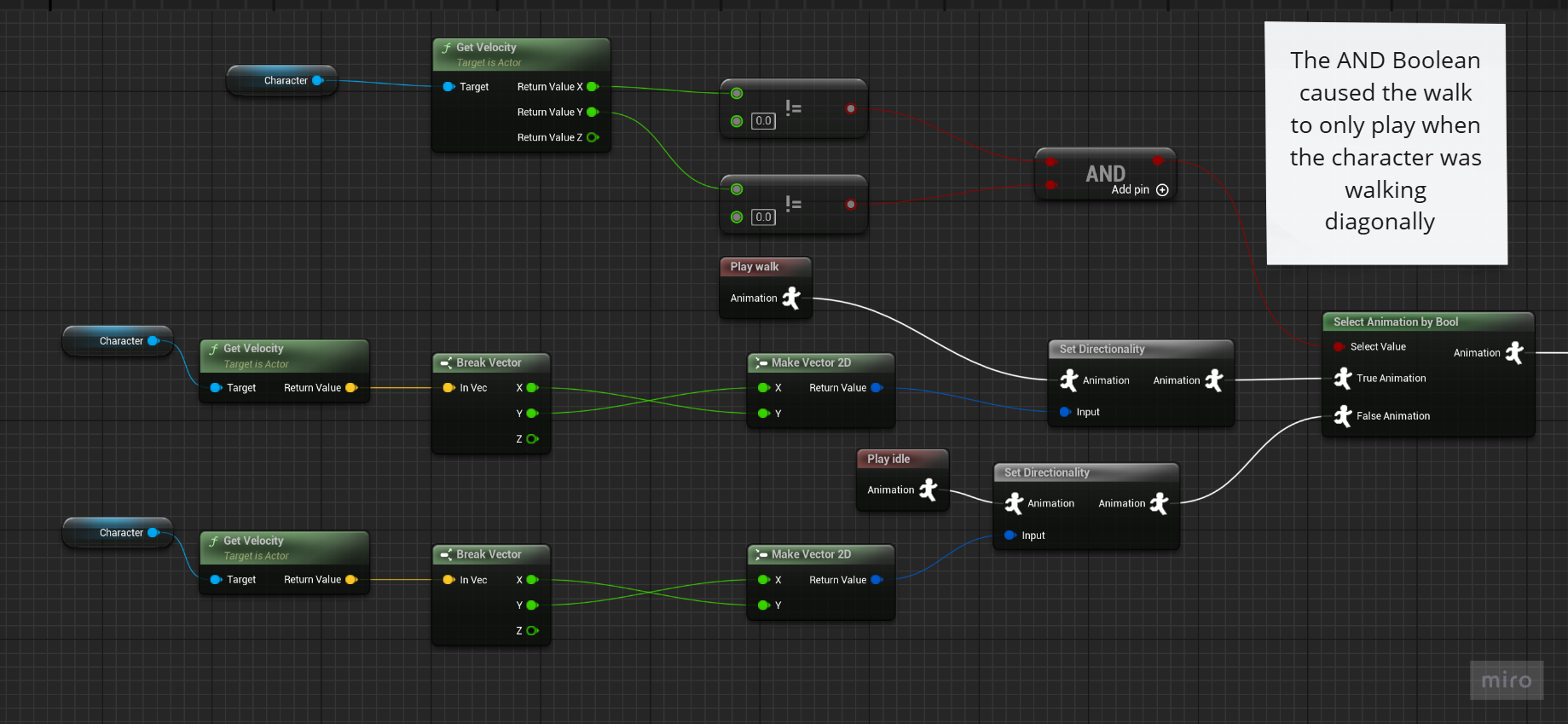 The animation graph was far harder. The first tutorials I found told me to set up the blueprint to select animation on Bool (Boolean), which I plugged a not equals (!=) node in that checked if the character’s X velocity was changing. This worked for making the character play a walk cycle when moving right or left but would only play when moving left and right. It would also only show the first animation in my multi directional sequence, which was the character walking backwards.