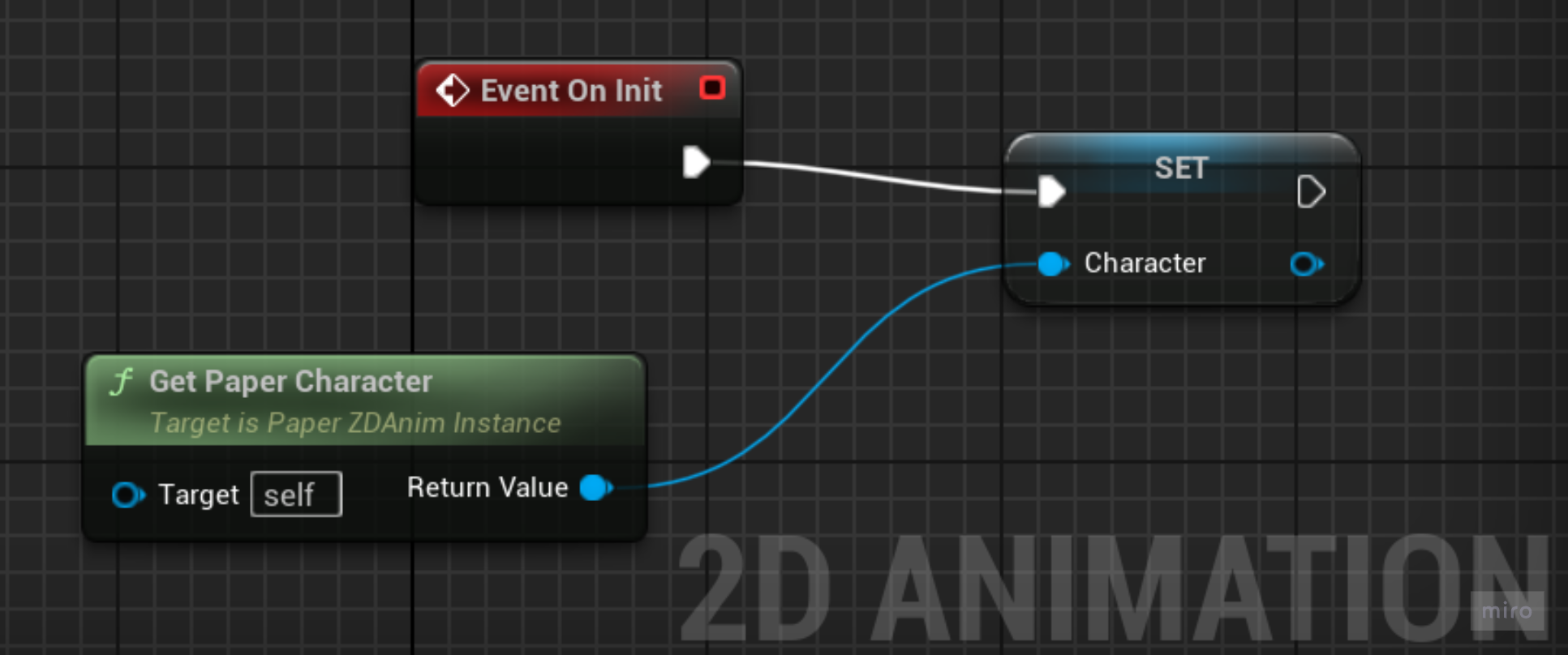 I then had to set up the animation blueprint. It is separated into the event graph and the animation graph. The event graph was simple as all that needed to be done was get a reference to the Paper ZD character and set it on initialisation of the game. This sets the sprite to appear when the game starts