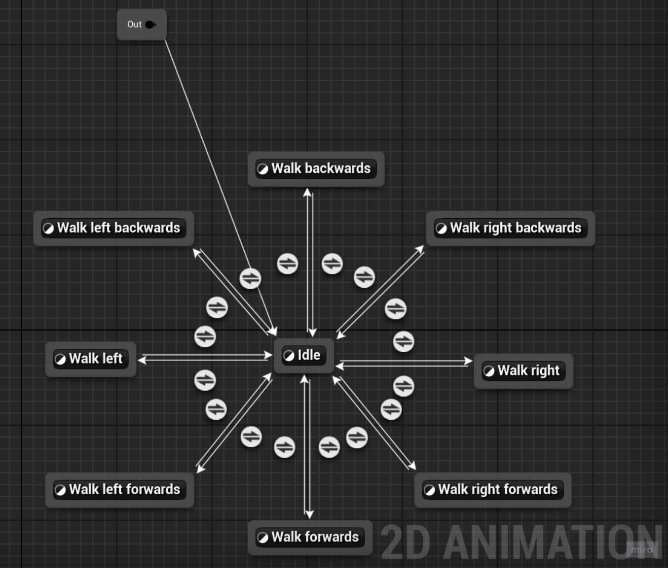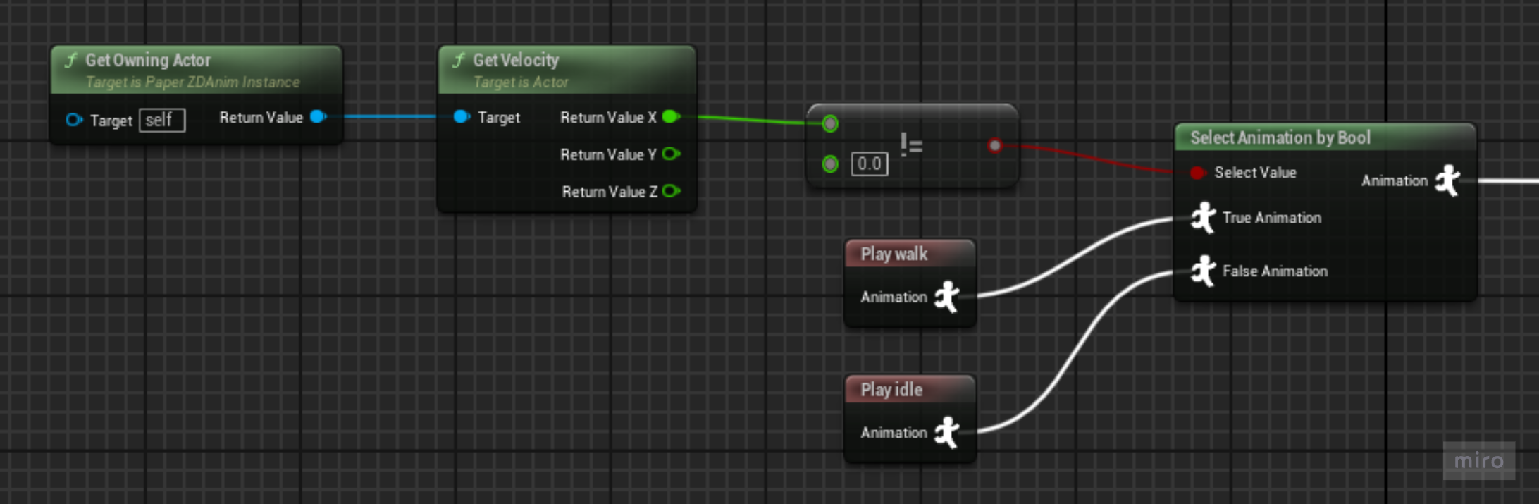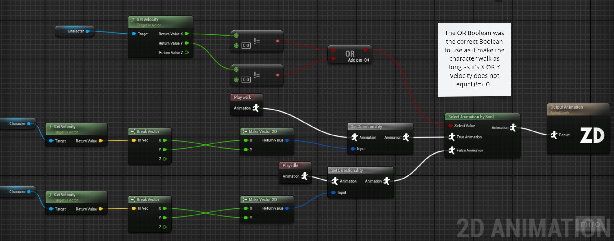 I decided that the state machine wasn’t the way forward and looked into the documentation of the Paper ZD plugin. It told me how to set up my animation with the multi directional sequences. The key turned out to be a single node called set directionality which takes data from the characters movement velocity broken and made 2D (X&Y rather than X,Y&Z) as the ground velocity is all that is needed and saves the Z velocity for a jump animation. I then set up the select animation by Bool to take the velocity and if the character was moving in the X&Y vectors then play the walk animation with the direction the character faces set by the directionality node. However this wasn’t right as on testing the walk animation would only play when the character was moving diagonally.