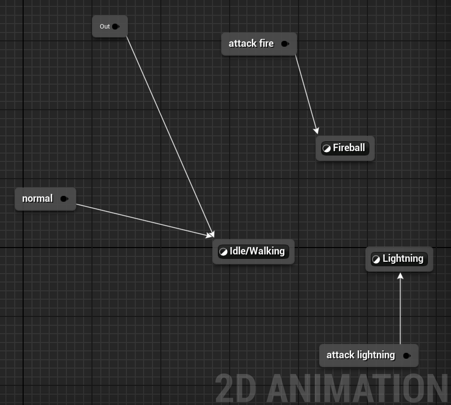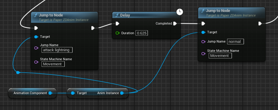 I swapped out the sprites in Unreal and did some testing and found I was annoyed by the way the animation override made the animation run it them look poor and reduced immersion. As planned I returned to the state machine and the idea of jumps. I learnt that I was calling the jumps wrong and I should be calling them in the player blueprint instead of the animation blueprint. I could now get the player blueprint to call the animation of click was still struggling to get the animation to stop playing. In the end I added a delay of the animation length after I called the attack jump and then added a second jump to return to the normal state. I applied this logic to both attack and it looked a lot cleaner and smooth.