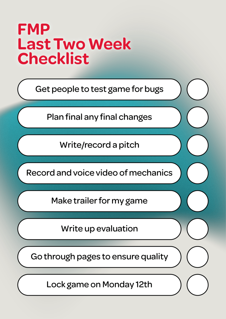 I have also proceeded to make a final two week checklist as planned to establish the order of priority tasks and ensure I get everything done that needs to be.