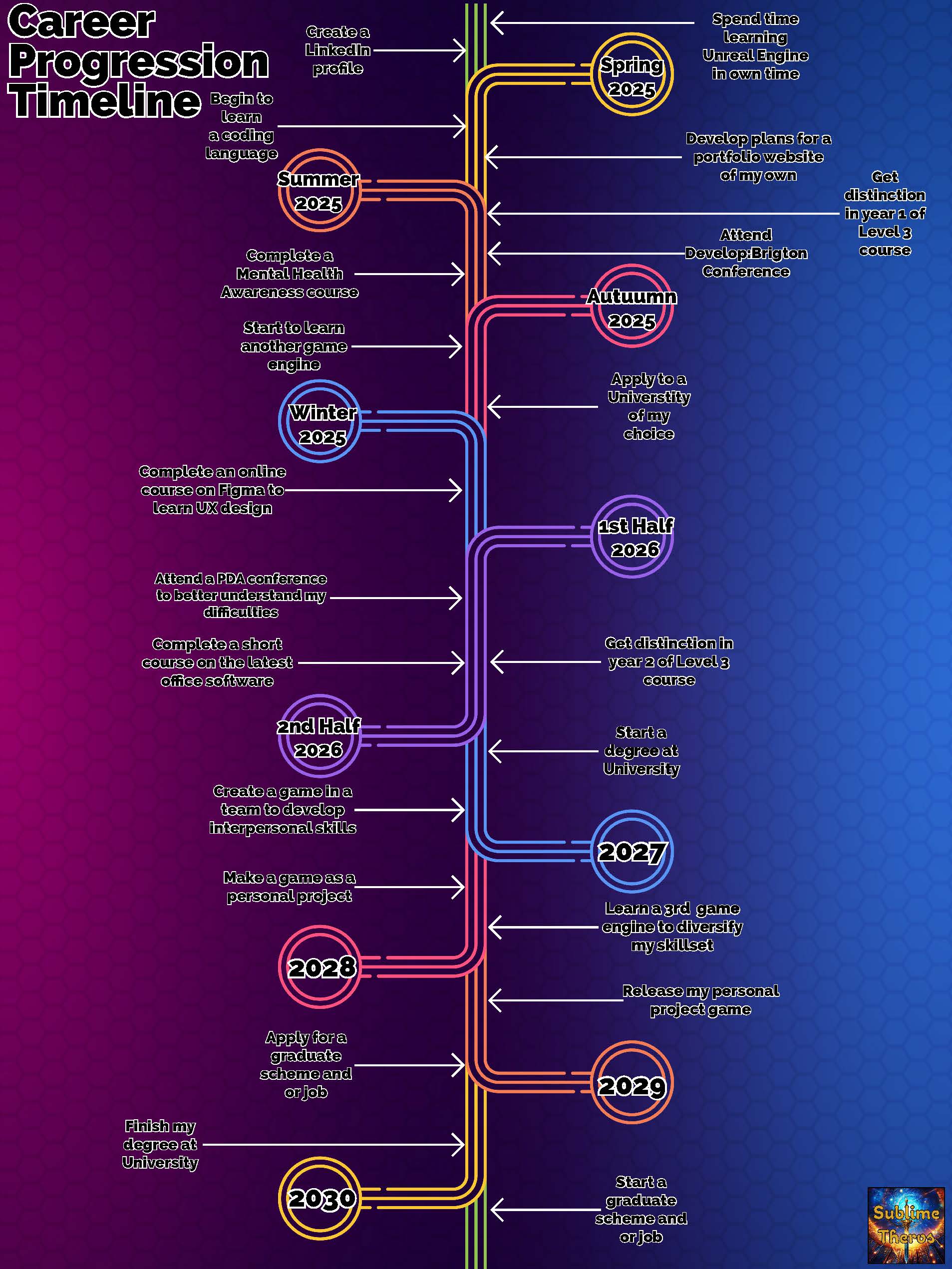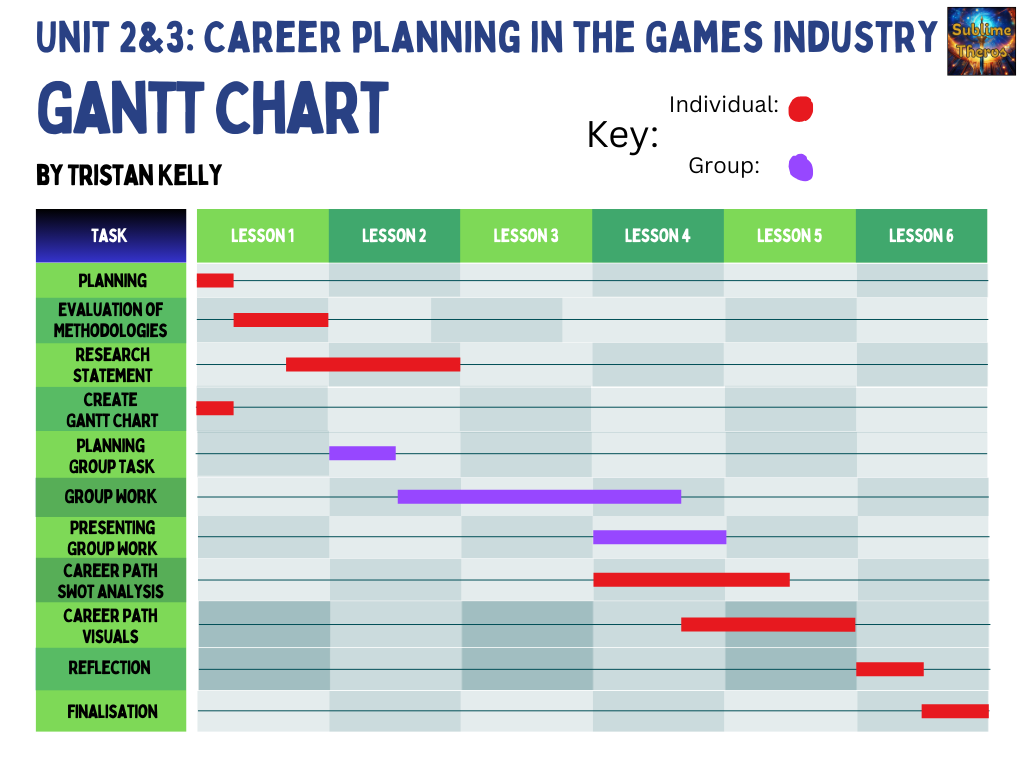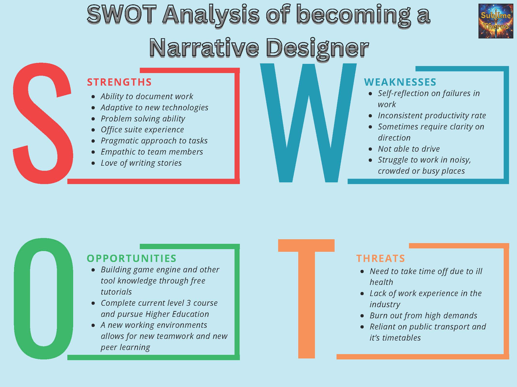 Overall, the work has helped me greatly as it was an introspective look at my future and the skills I need to develop to attain the job I want in the industry. I struggled with the critical assessment of myself needed for the SWOT analysis as I tend to very self-deprecating without seeing the positive of what I can do. I also struggled looking forward to create a timeline for my improvement as I felt existential dread at the prospect of my future as I am a pessimistic person; looking forward has always been an issue as all I see is an insurmountable hill to climb. Powering through my issues I was able to utilise online tools to create a complex but achievable plan for the future for myself. Having researched the requirements for a Narrative Designer I feel my strengths lean towards this type of role, that I would enjoy and find fulfilling and if I stick to my progression timeline it is something I can achieve.