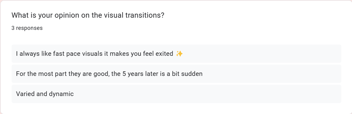 - I need ensure visual transitions flow nicely, are not sudden and feel earnt for the viewer.
