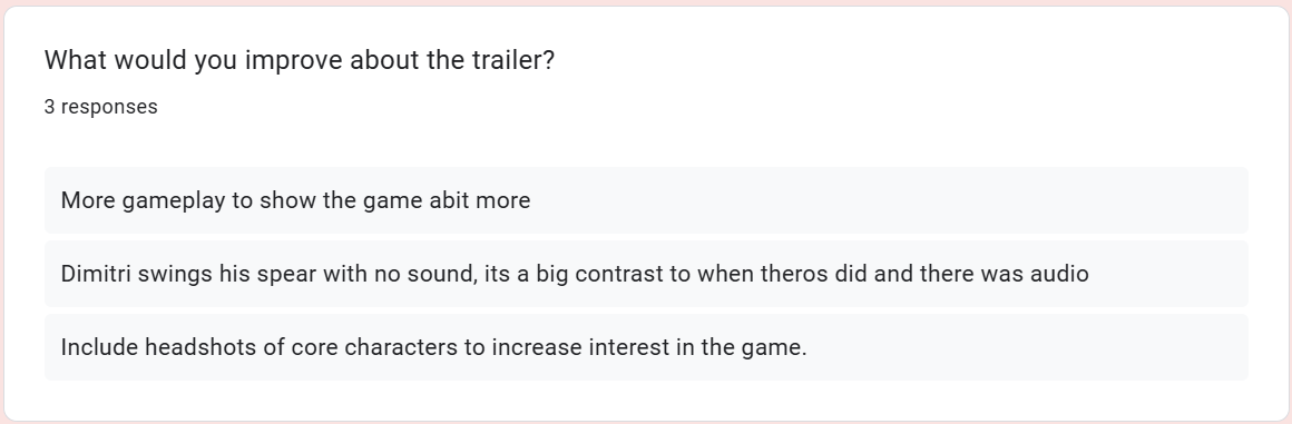 I feel my research helped me learn how to build some kind of structure to my trailer and what makes a trailer engaging. I opened the trailer and focused a good amount of the trailer on Dimitri’s rivalry with Edelgard. I showed how Byleth pulled Dimitri out of his despair spiral, showing hope to the viewer as something to latch onto. I then showed how Dimitri lost his last father figure in Rodrigue and how this helps him become king and face his demons and Edelgard. I found making the storyboard made me consider how the trailer would flow earlier in the production process so I could figure out its pacing. I also found the audio planning useful to set out what I would need to create even though that list expanded as I built my trailer.
