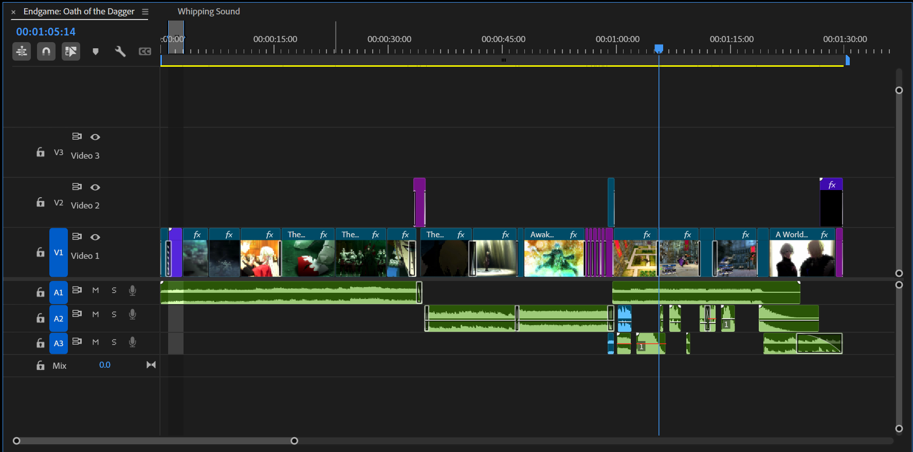 The timeline where I was having issues transtioning the audio between sections of the Trailer (for further details see relfection)