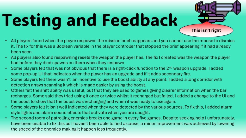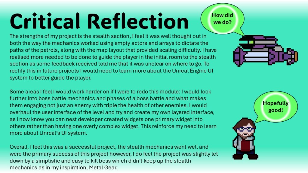 This module covered topics such as: Health Systems, Weapons, Timers, Basic Enemy AI, Parent and Child Classes, Materials, Particles and Meta Sounds. In addition I added features such as: a Boss Battle, Enemy Spawning, a Stealth System and use of a Post Effect Volume to make the game look retro